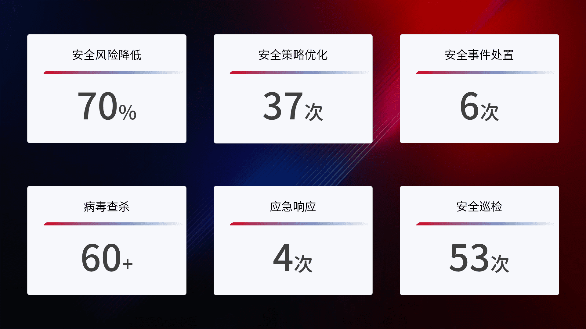提供全面的安全事件报告体系,,包括处置报告、、周报、、季度和年度总结,,,,结合持续监控,,,帮助客户深入了解网络安全状况。。