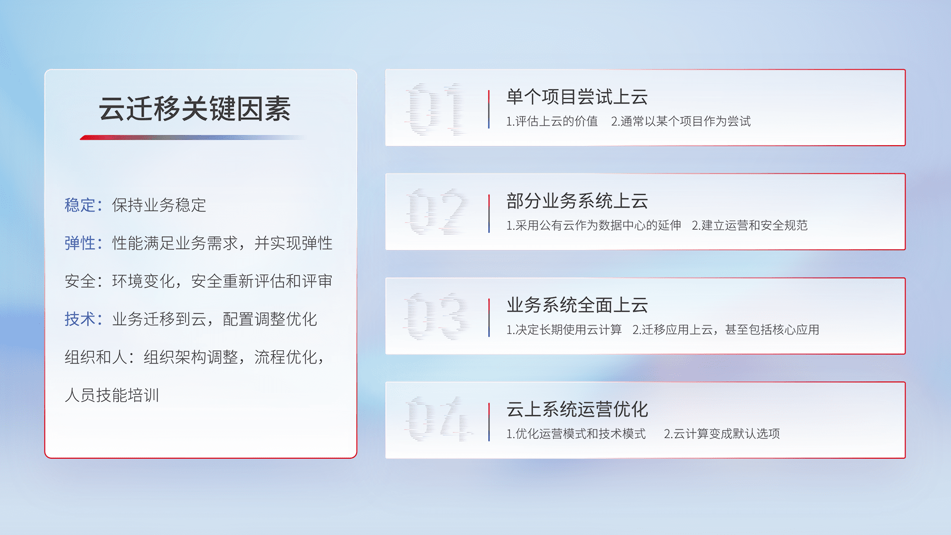 结合实际业务,,,从规划设计、、云平台选型、、云原生改造、、数据迁移、、、集成交付,,,,迁移全过程为客户识别最佳上云路径,,,,做好风险识别管理,,,设计网络架构、、、、身份权限、、、、安全审计合规、、、、操作审计、、日志审计、、监控告警策略、、、、多站点容灾设计等,,,对云上基础设施进行整体规划,,,提升IT治理水平,,以满足弹性、、、、高可用、、高性能的需求。。。