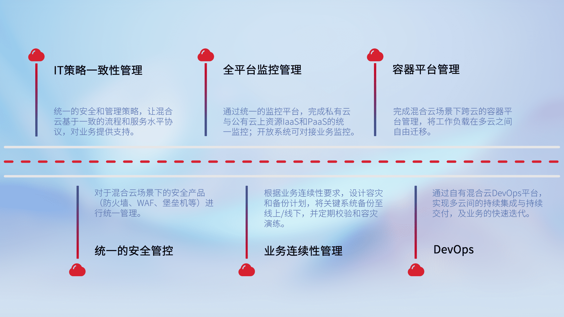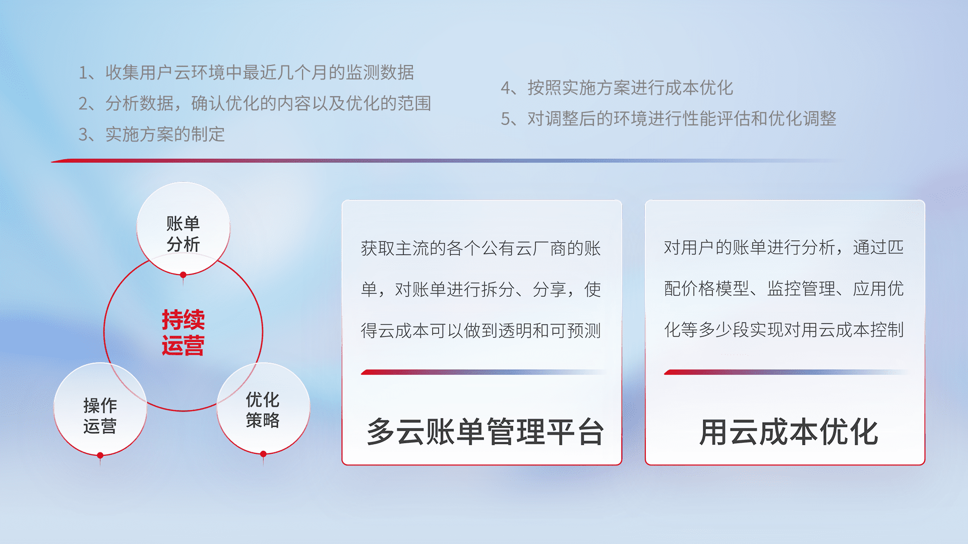通过多云纳管,,以统一的资源数据模型把客户的云资源进行抽象和封装,,进而实现对多云资源的统一操作,,,,保障云资源管理的可靠性、、、稳定性与可用性。。量身定制化运维内容,,,配置、、、、开发运维、、补丁管理、、、备份、、、监控、、、、认证和访问管理、、、审计和日常巡检等,,,保障在用云过程中的可靠度,,,,稳定度以及高可用率。。。。